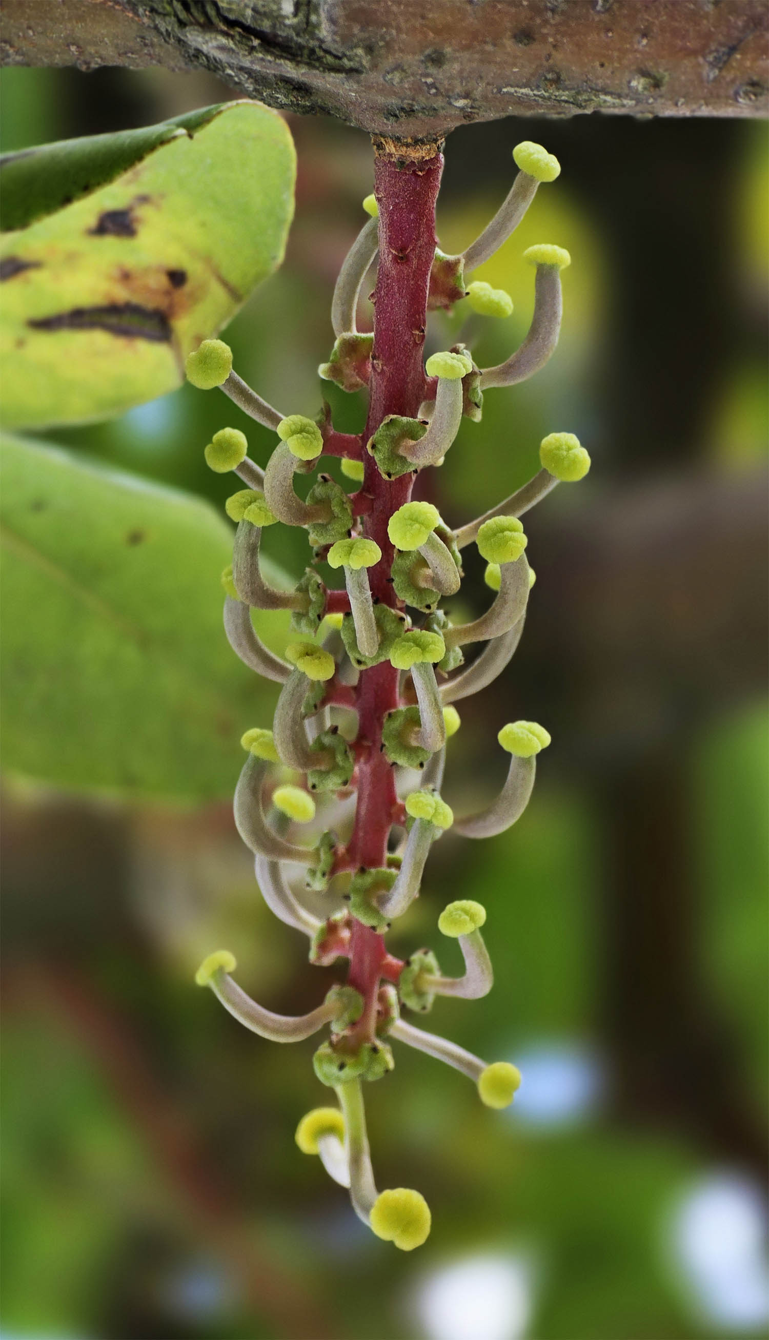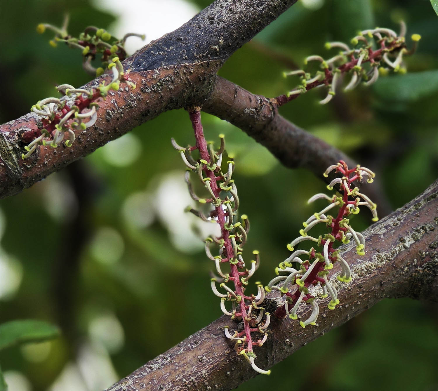 La floraison intervient entre juillet-août et novembre sous forme de chatons dressés, jaunâtres ou rougeâtres, constitués de plusieurs dizaines de petites fleurs sans pétales, à l'odeur souvent peu agréable.