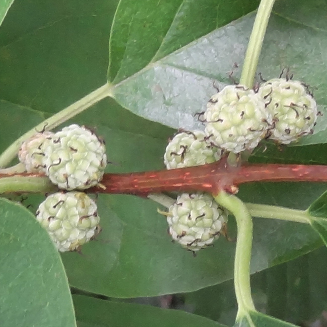 On trouve parfois quelques fleurs femelles sur les arbres mâles.