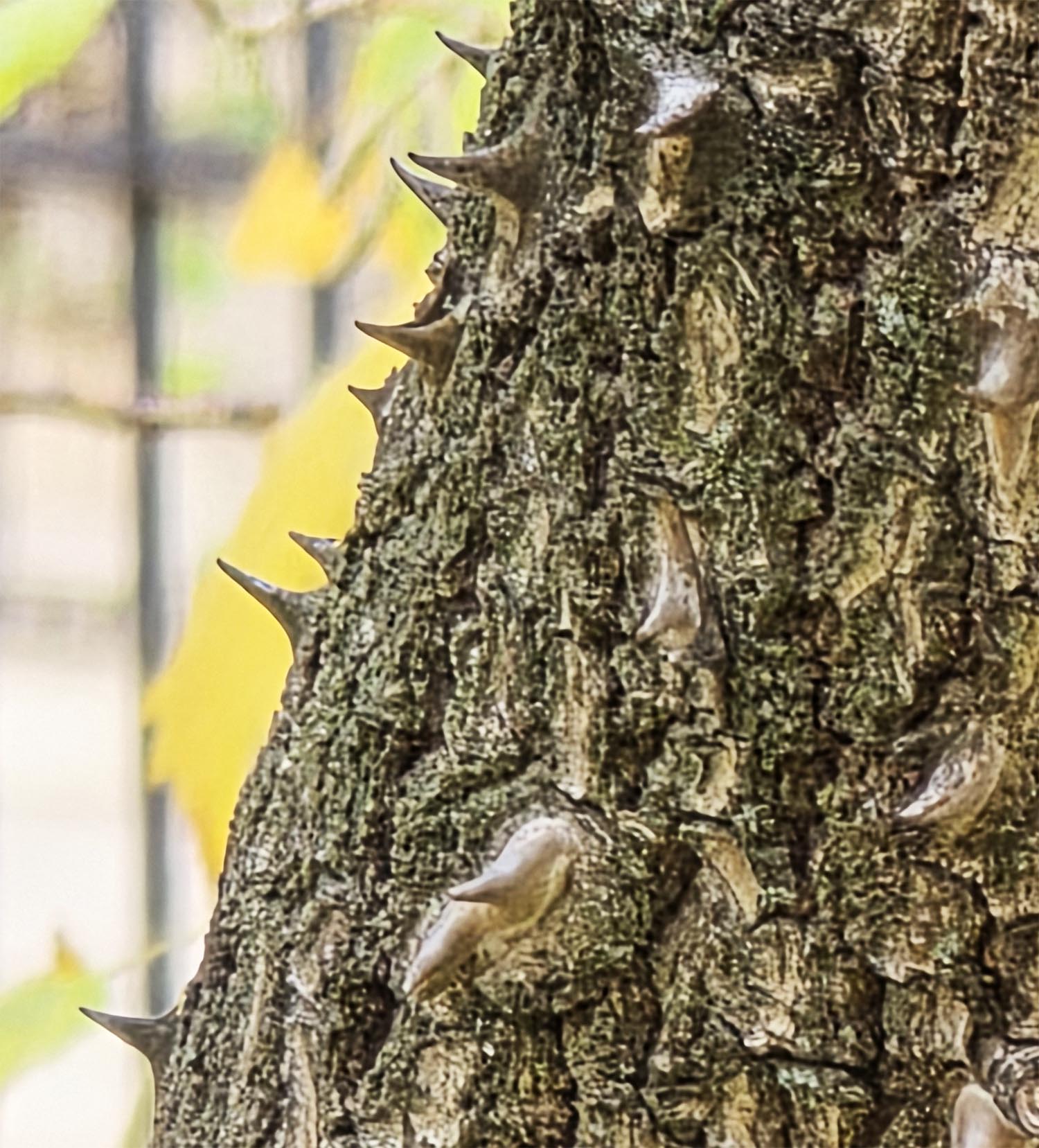 Les rameaux et le tronc portent de grosses épines jaunâtres ou grises