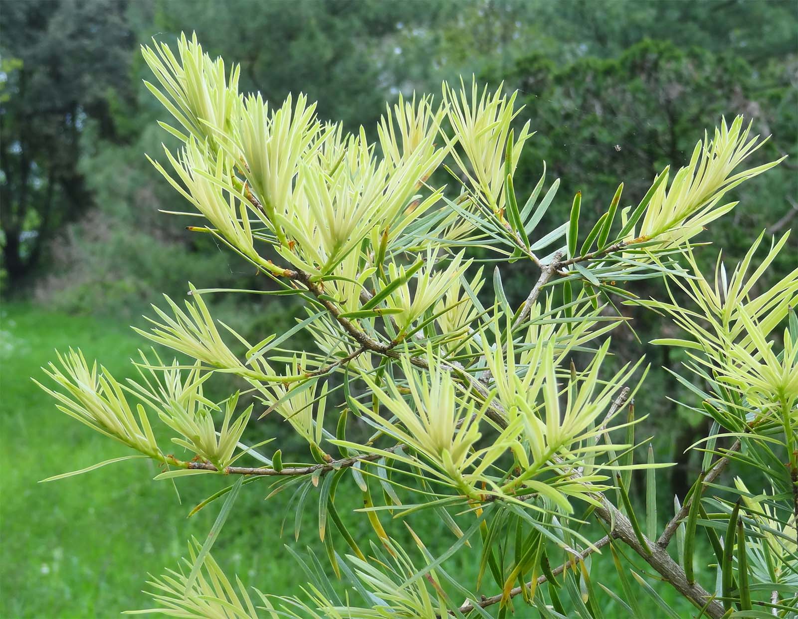 Ses aiguilles vert brillant, disposées en spirale sur les rameaux (mais tordues à la base pour donner l'apparence de feuilles opposées) mesurent entre 1 et 3 cm de long et 2 à 5 mm de large, ce qui les fait ressembler à des feuilles d'