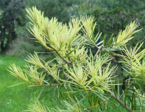 Leurs aiguilles, disposées en spirale sur les rameaux, mesurent 2 à 6 cm de long et 2 à 5 mm de large. Elles sont droites ou légèrement courbes, plus pointues sur les jeunes spécimens. Elles portent deux bandes de stomates sur la face inférieure.