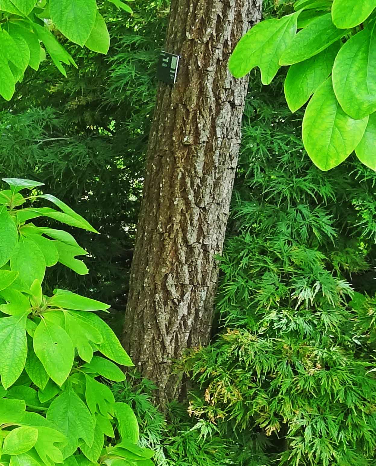 L'écorce gris-brun du tronc, d'abord lisse, devient rapidement et de plus en plus profondément crevassée.