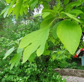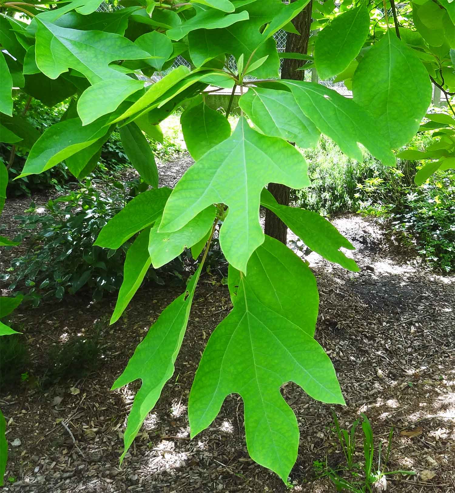 Ses feuilles, disposées de manière alterne sur les rameaux, peuvent se présenter sous des formes différentes : certaines sont simplement ovales allongées terminées en pointes, d'autres sont divisées en deux lobes et d'autre encore en trois lobes (un peu comme des feuilles de