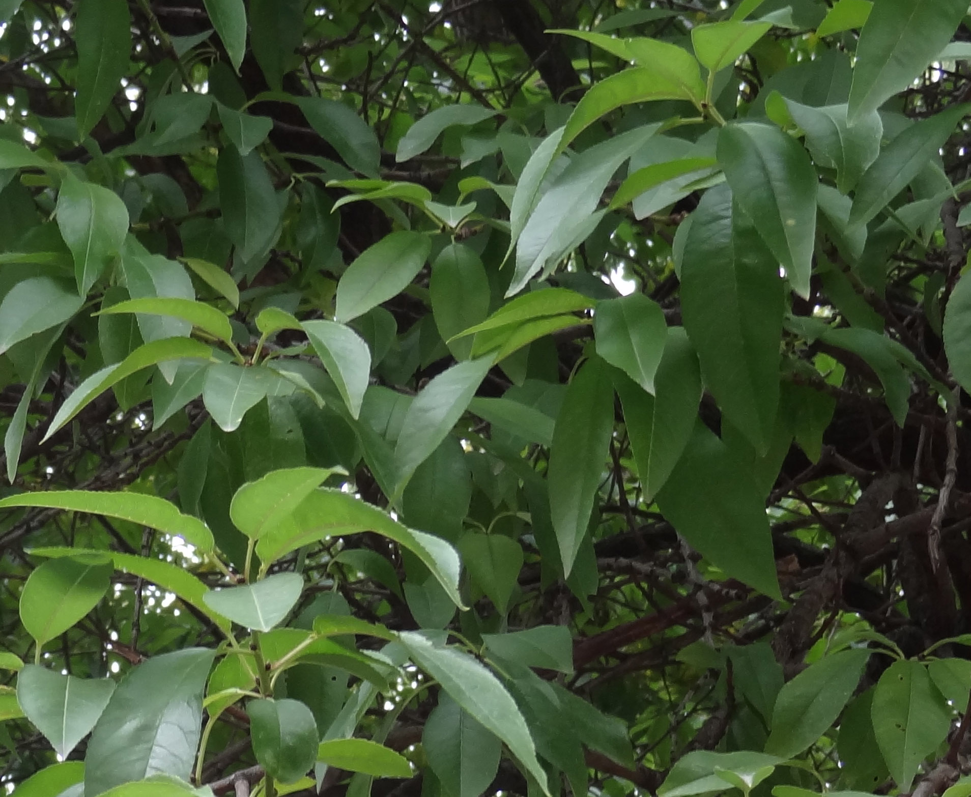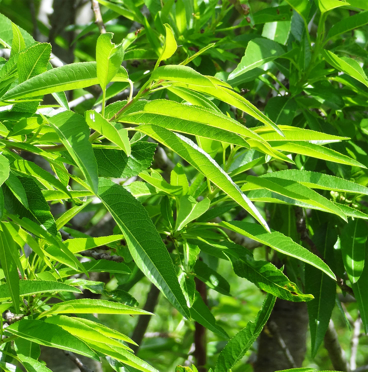 ▼. Elles sont portées par un court pétiole qui porte souvent quelques glandes nectarifères. Elles dégagent une légère odeur d'amande. Elles sont souvent légèrement gaufrées, souvent un peu pliées longitudinalement le long de la nervure principale, et souvent recourbées vers le bas, parfois pendantes.