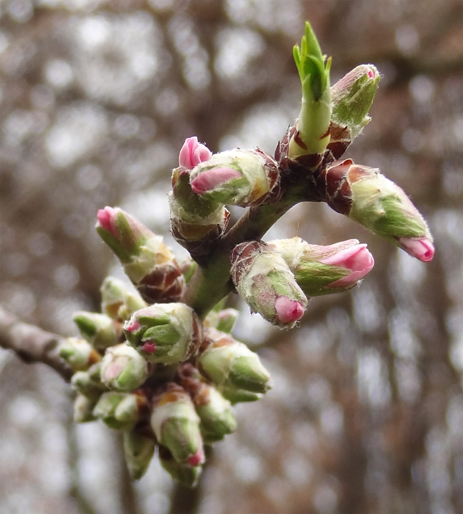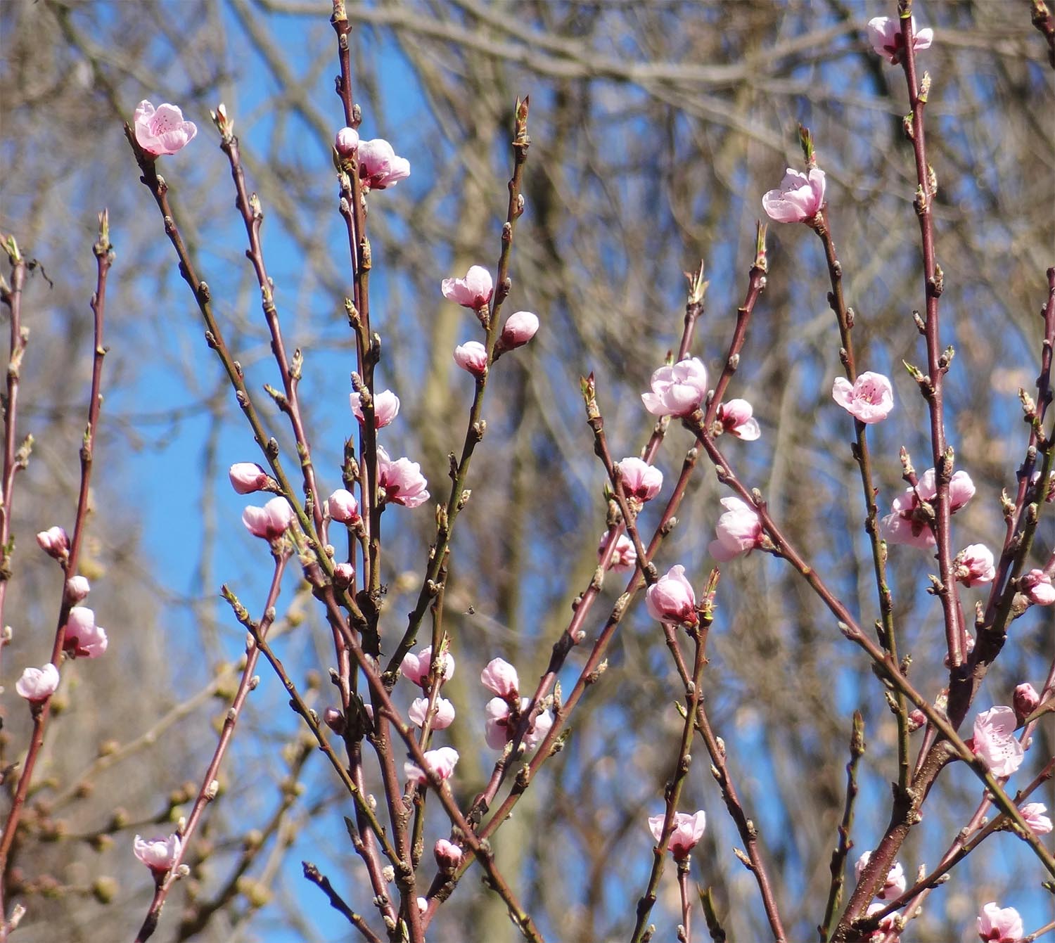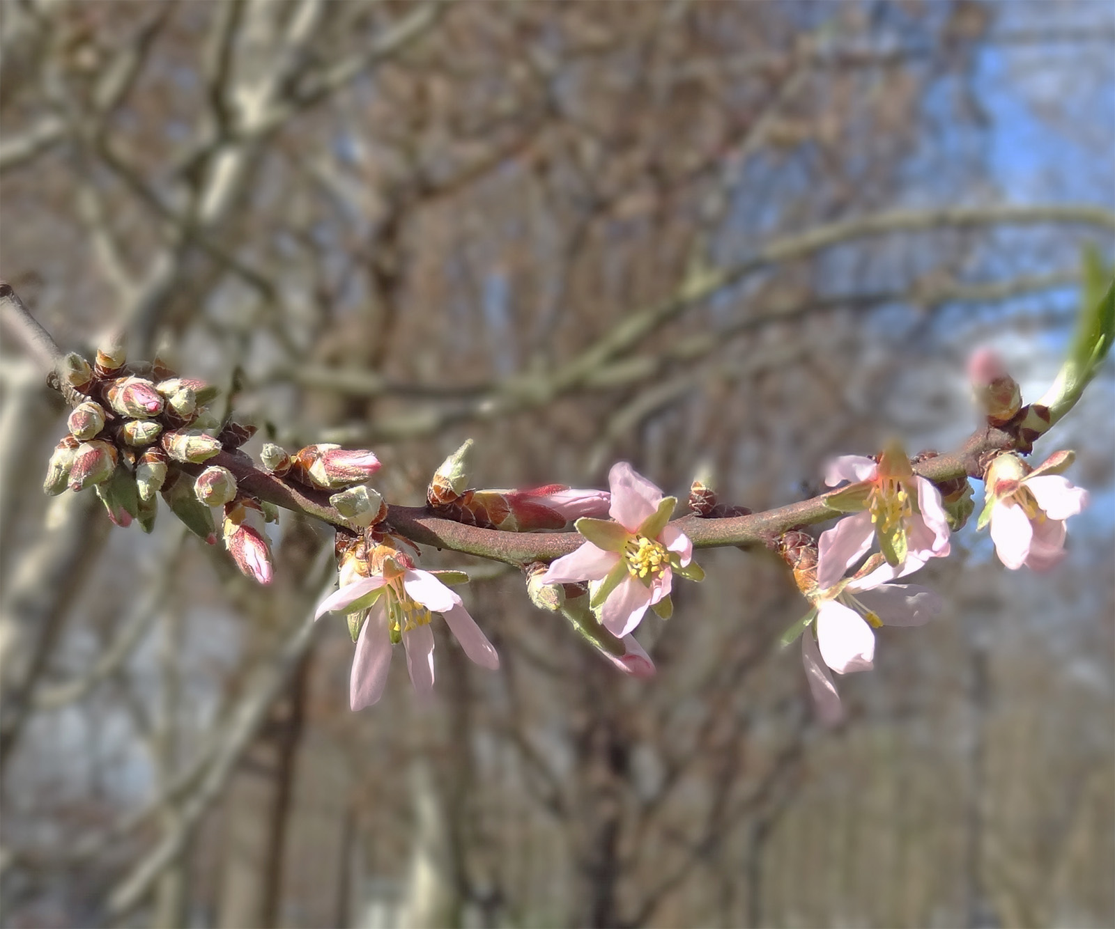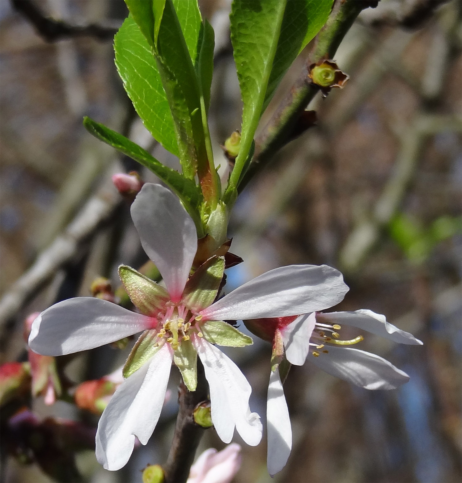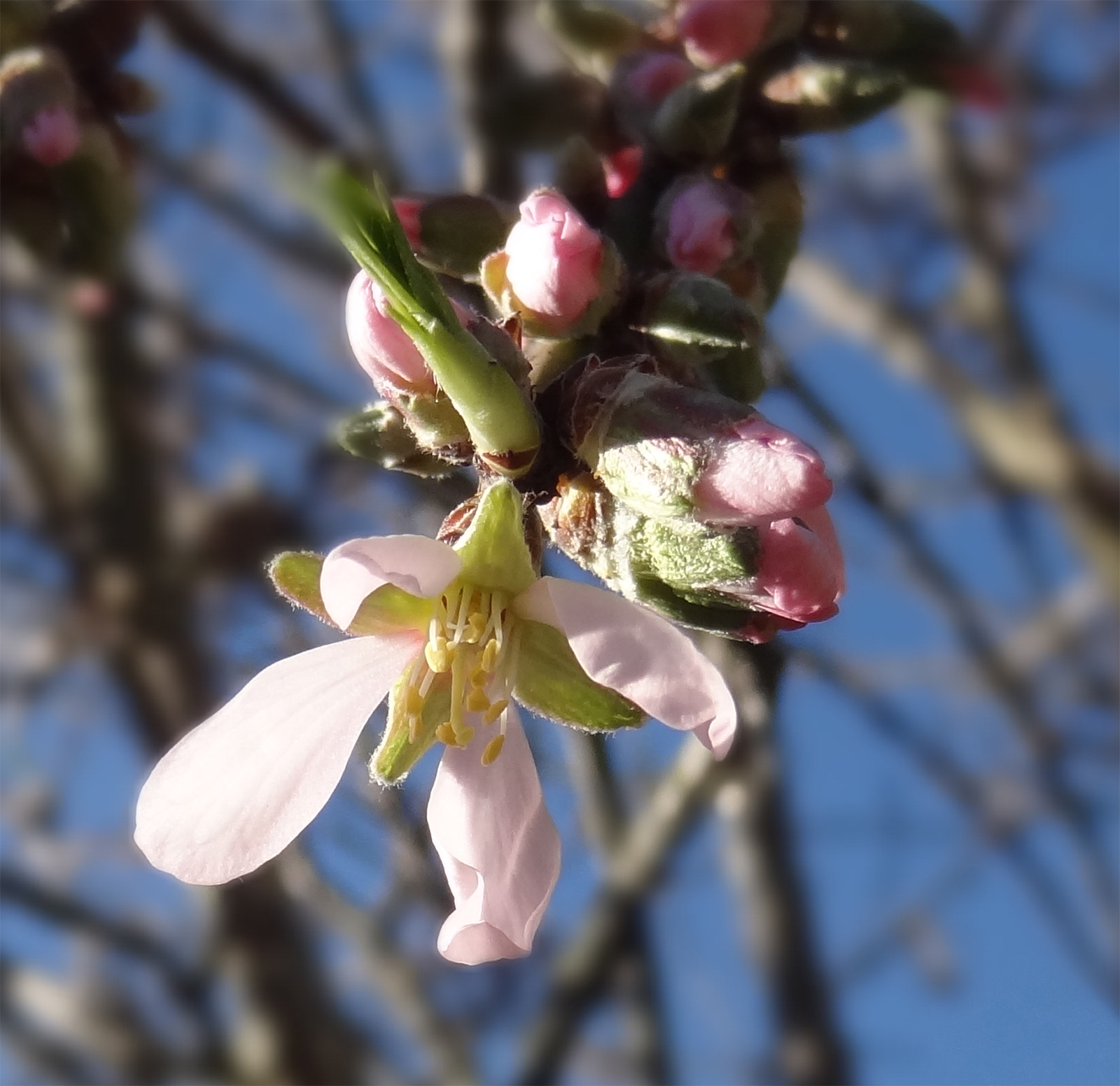 La floraison intervient très tôt, dès février-mars, parfois avril (et encore plus tard pour certaines variétés), avant l'apparition des feuilles, avec des fleurs à 5 pétales roses ou blancs (rouges pour certaines variétés) et une vingtaine à une trentaine d'étamines.