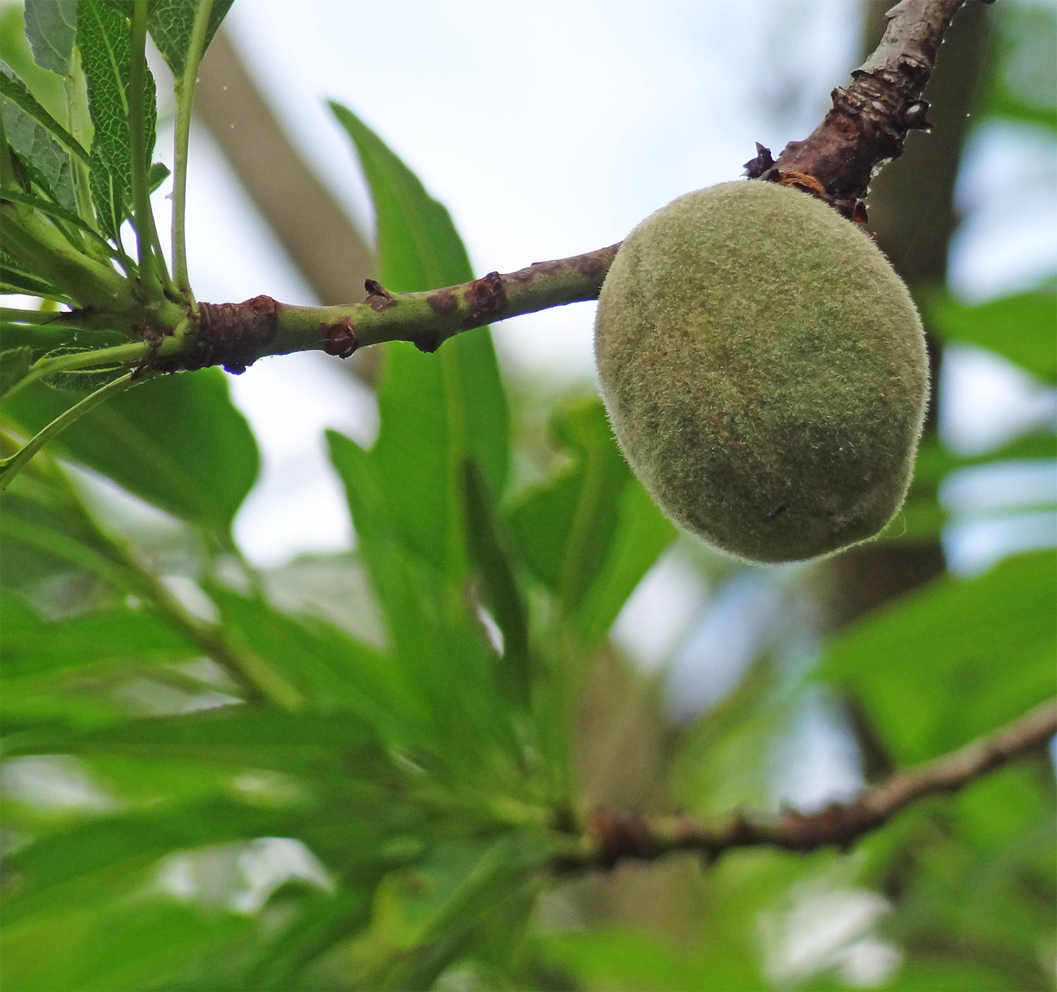 Le fruit, la pêche, est presque sphérique avec une peau duveteuse. Il contient un noyau très sillonné, avec une amande toxique.