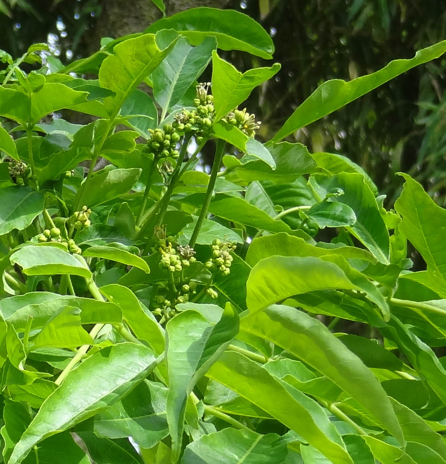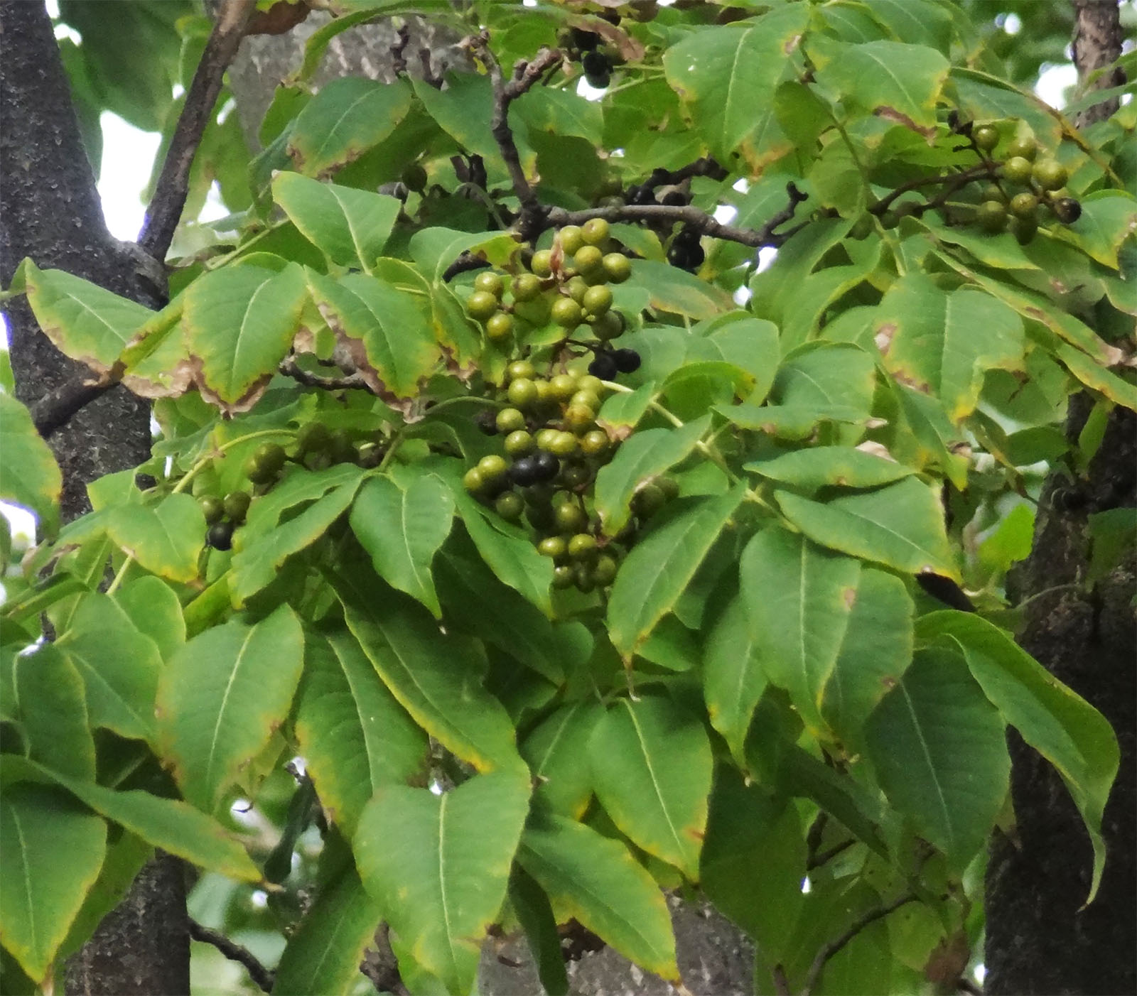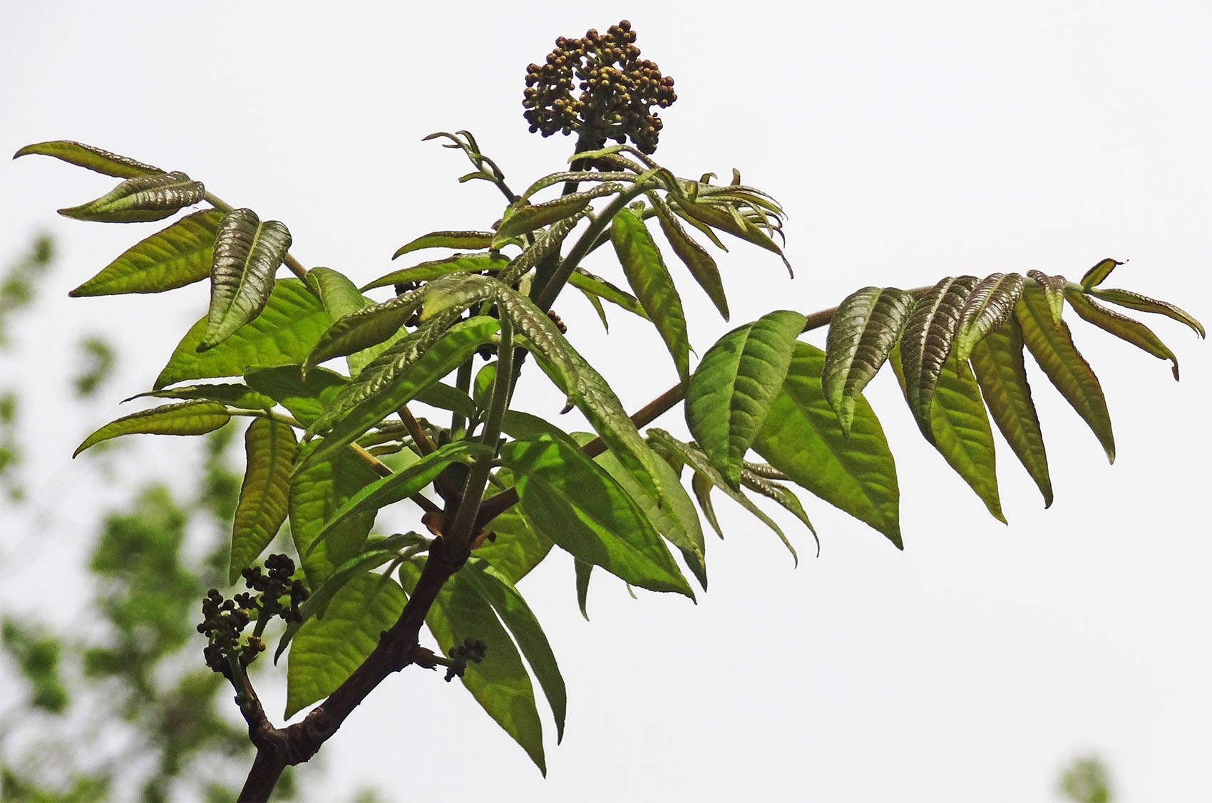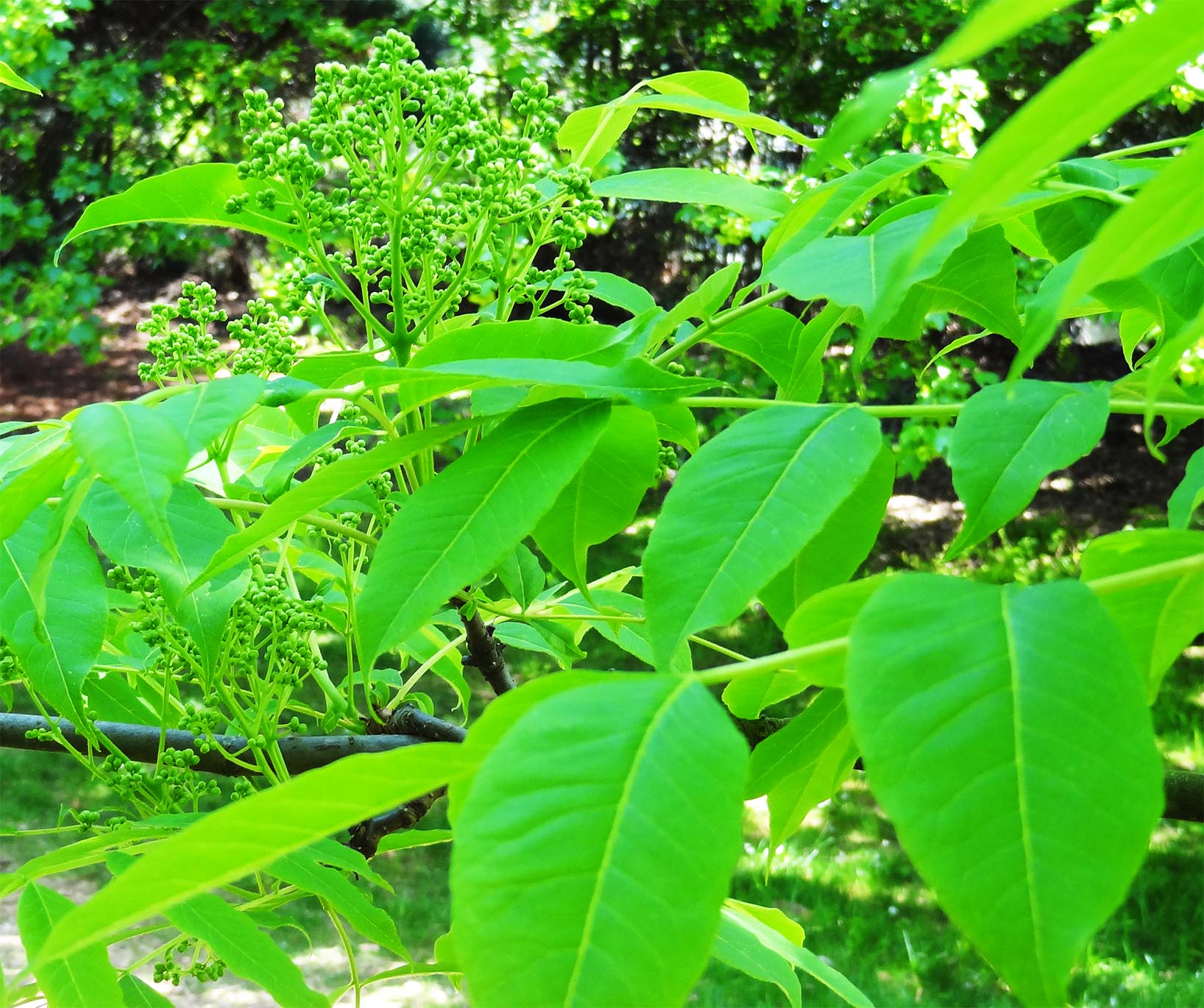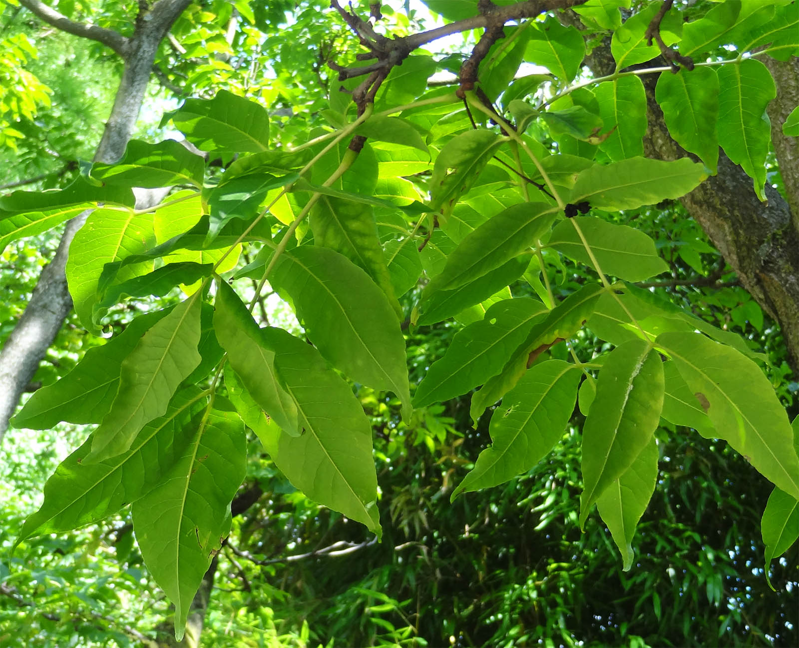 Ses grandes feuilles (20 à 40 centimètres de long), disposées de manière opposée sur les rameaux, sont composées d'un nombre impair (une dizaine) de folioles ovales allongées terminées en pointe