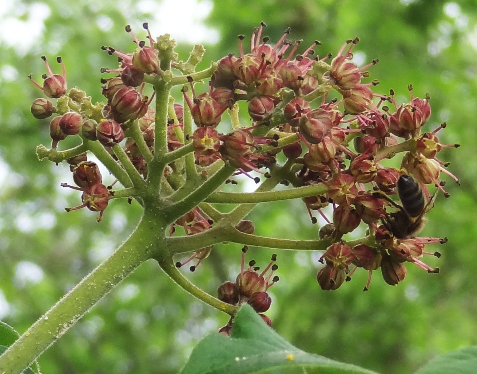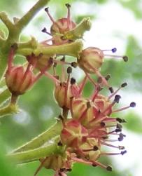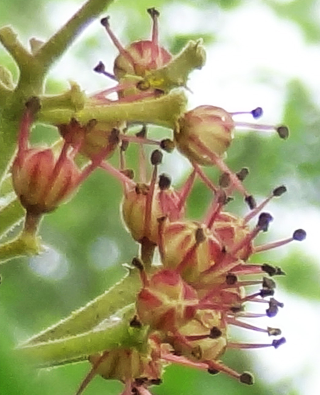 La floraison intervient en mai-juin sous forme de grappes dressées de petites fleurs verdâtres, fleurs mâles et femelles sur des pieds séparés.