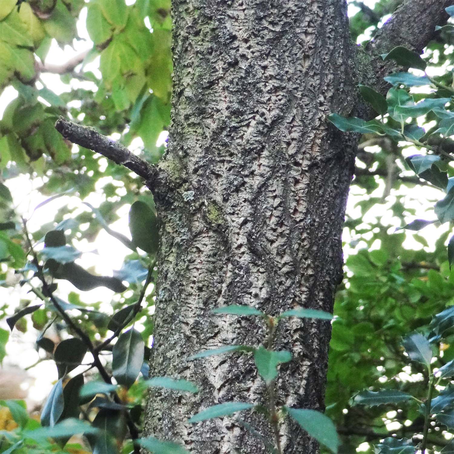 L'écorce, d'abord jaunâtre ou brunâtre et ondulée chez les jeunes sujets, devient avec l'âge grisâtre, très épaisse, liégeuse et profondément sillonnée.