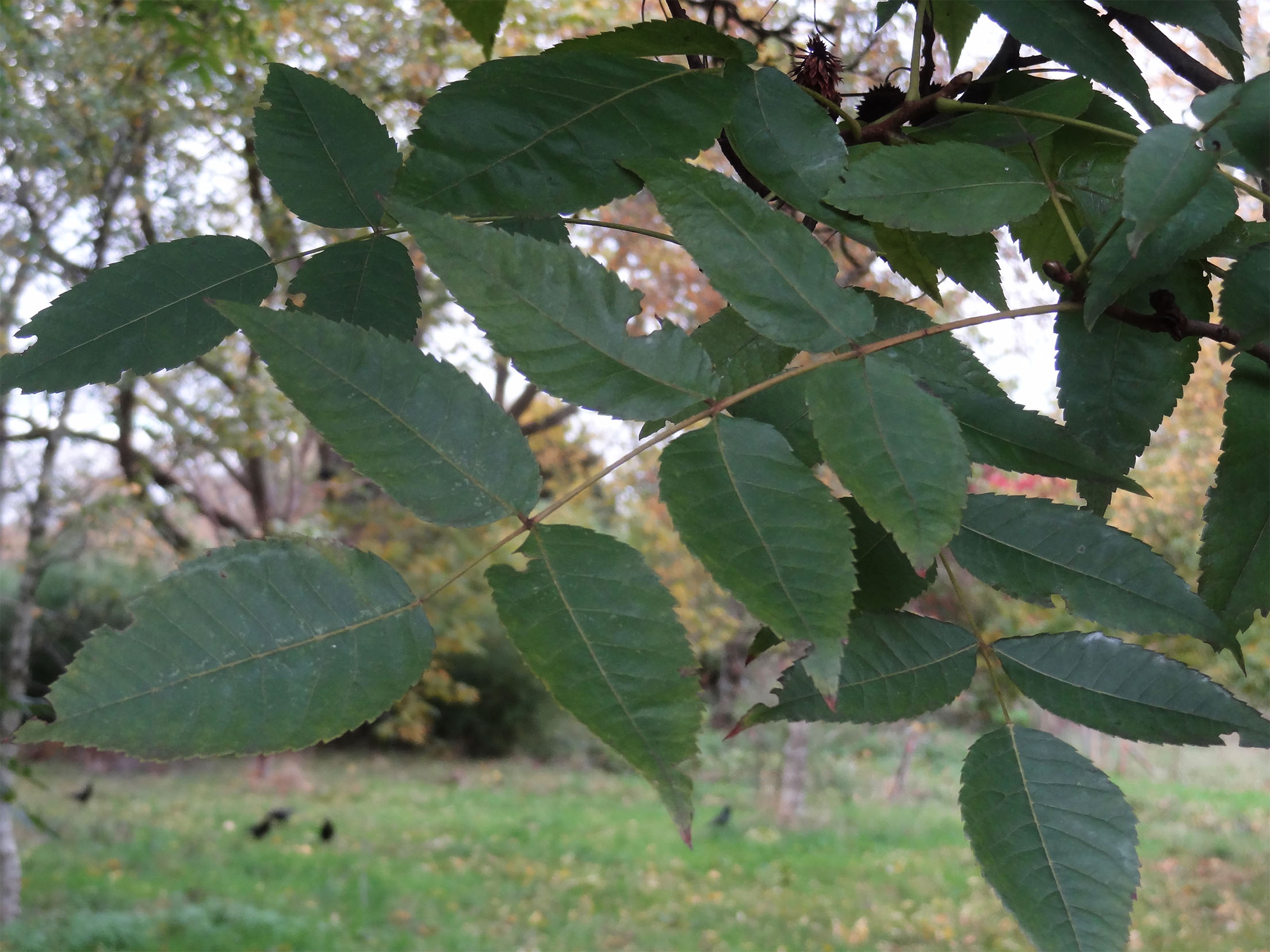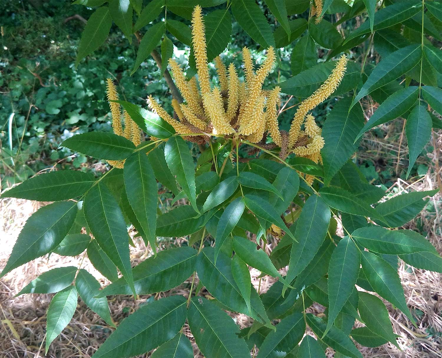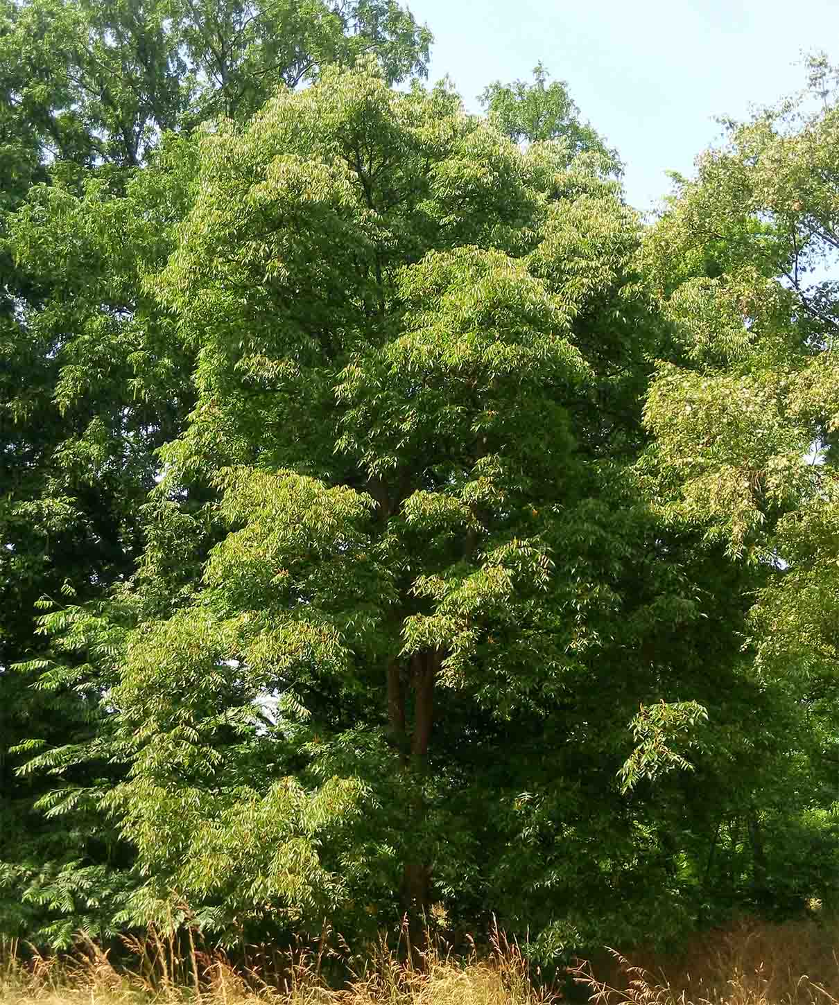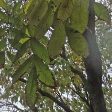 Ses feuilles, disposées de manière alterne sur des rameaux brunâtres ou jaunâtres, sont grandes, jusqu'à 30 centimètres de long, divisées en un nombre impair (généralement 7 à 15, parfois moins, parfois jusqu'à 23) de folioles ovales, dentées, terminées en pointe. Les folioles latérales sont rattachées directement au pétiole, opposées deux par deux