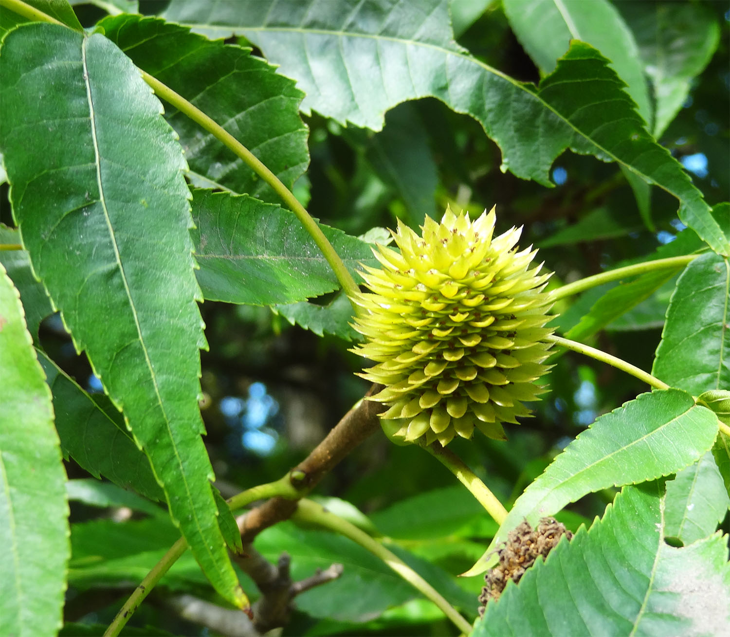 Entre juillet et octobre, les chatons femelles se transforment en fruits ovales, d'abord verts, puis secs et bruns, longs de 3 à 5 centimètres qui ressemblent à des cônes hérissés de nombreuses pointes (bractées)