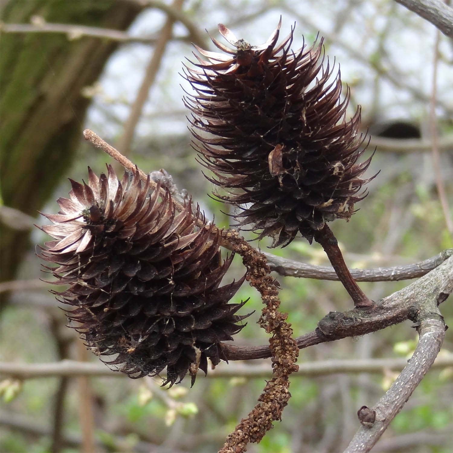 Très caractéristiques, ils restent longtemps sur l'arbre après avoir libéré leurs graines, jusqu'au printemps, ce qui est un moyen d'identification commode.