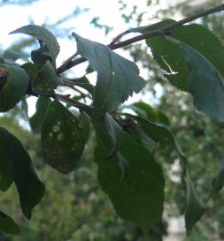 Ses feuilles finement dentées, disposées de manière alterne sur des rameaux un peu épineux, sont ovales et mesurent entre 3 et 7 centimètres de long.