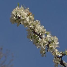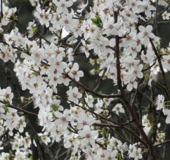 La floraison intervient tôt au printemps, en mars-avril (parfois jusqu'en mai), avant (ou parfois en même temps que) l'apparition des feuilles, sous forme de petits bouquets de deux ou trois fleurs blanches.