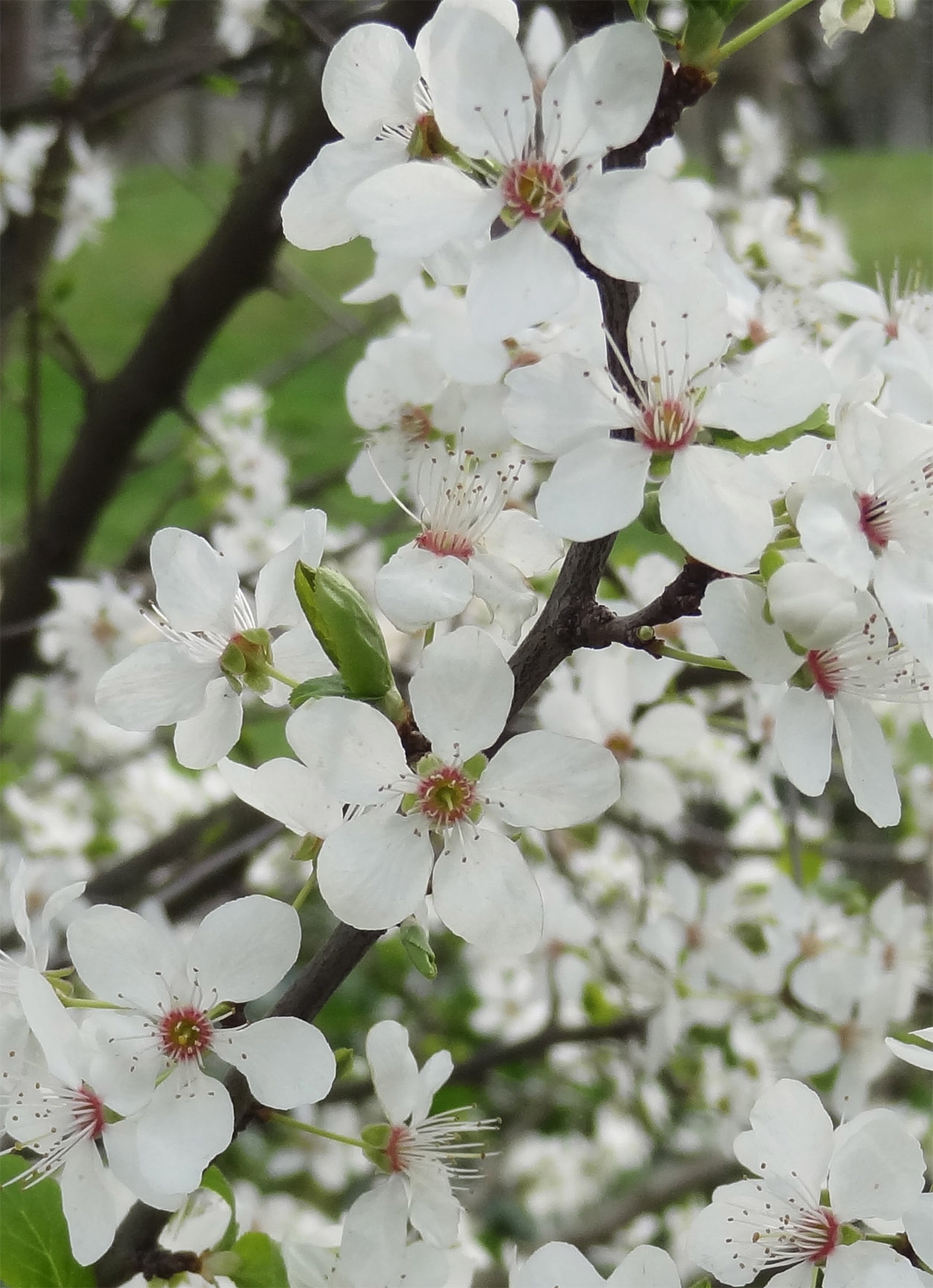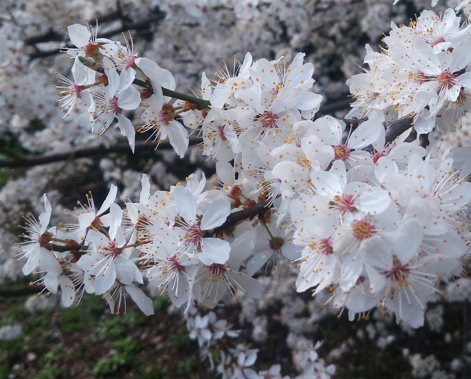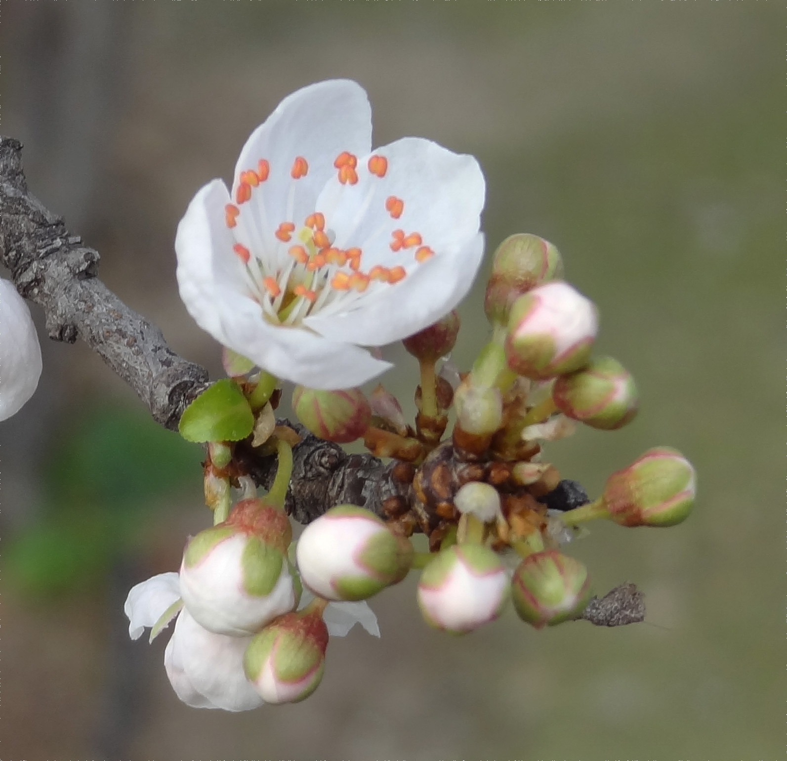 La floraison intervient très tôt à la fin de l'hiver ou au début du printemps, sous forme d'un très grand nombre de petits bouquets de fleurs blanches (souvent par trois) qui couvrent l'arbre avant ou en même temps que l'apparition des feuilles. Elle est plus précoce et plus abondante que celle du prunier européen.