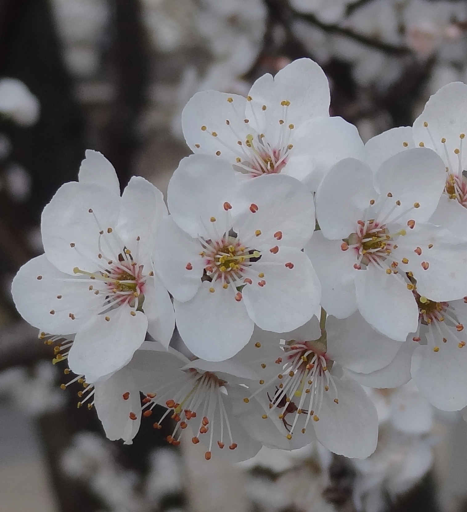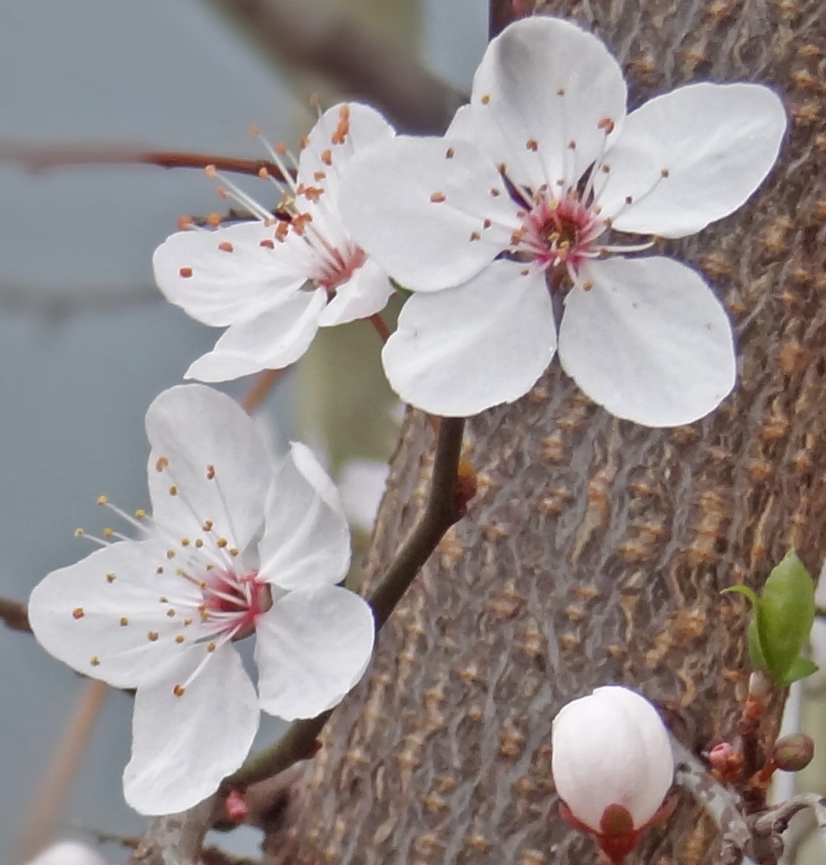 Dans la variété 'Pissardi', les fleurs sont portées par des pédoncules rougeâtres, les pétales sont rose pale ou blancs, mais les anthères roses plus ou mois soutenu et les sépales rougeâtres ou roses, visibles entre les pétales, leur font un coeur rose caractéristique