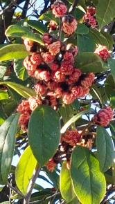 Sycoparrotia) : de petits bouquets pendants d'une dizaine d'étamines filiformes jaunâtres avec l'extrémité rouge ou orange sortant des restes de l'enveloppe brunâtre et velue du bouton floral